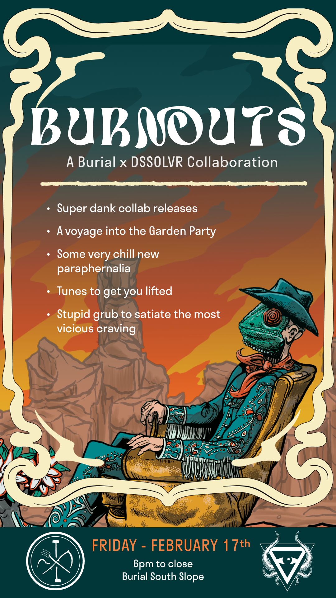 We’ve teamed up with our buds from DSSOLVR to bring you Burnouts: a weekend of tomfoolery in AVL. On Friday, 2/17, they’ll make the trek down to our South Slope Taproom for an evening of stoner food specials, collaboration beer releases, limited merch drops, and one hell of a trip. We’ll follow up this party with a trip back up the hill for a righteous throw down at the DSSOLVR Taproom on Saturday the 18th.