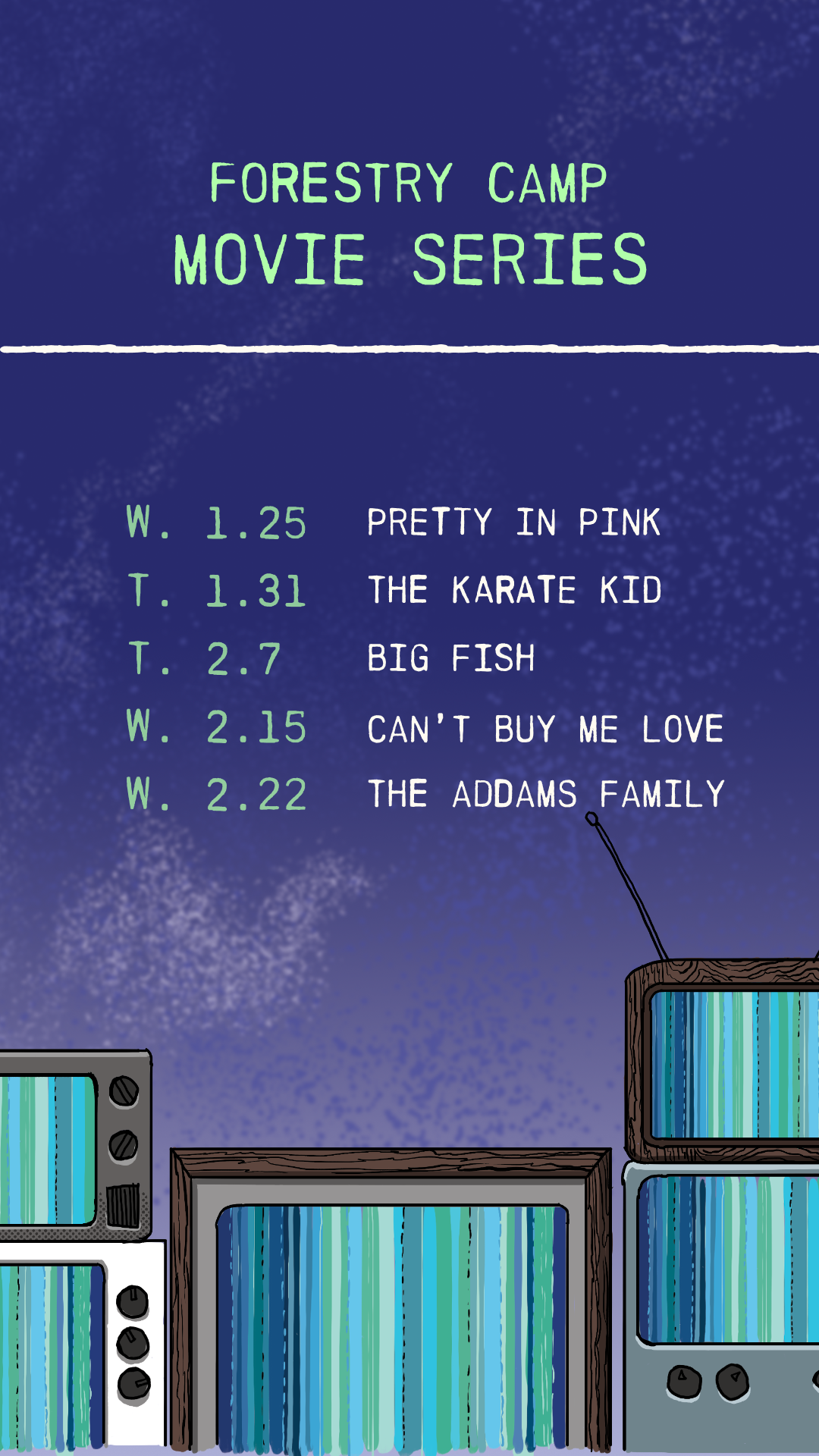 Eat, drink, watch, and relax. Enjoy a movie in the upstairs of Forestry Camp throughout the winter.