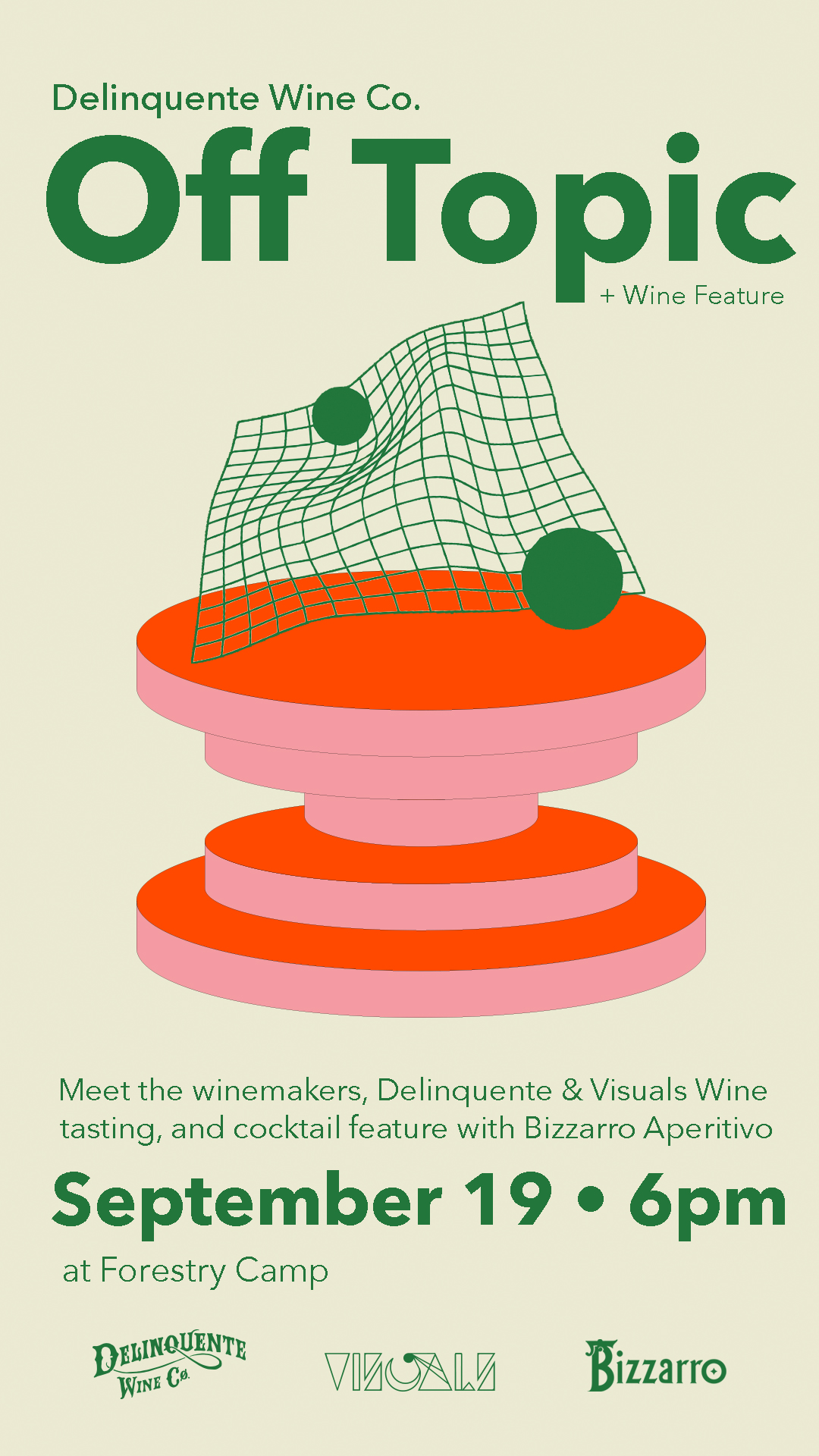 Meet the winemakers, Delinquente & VISUALS wine tasting, and cocktail feature with Bizzarro Aperitivo.