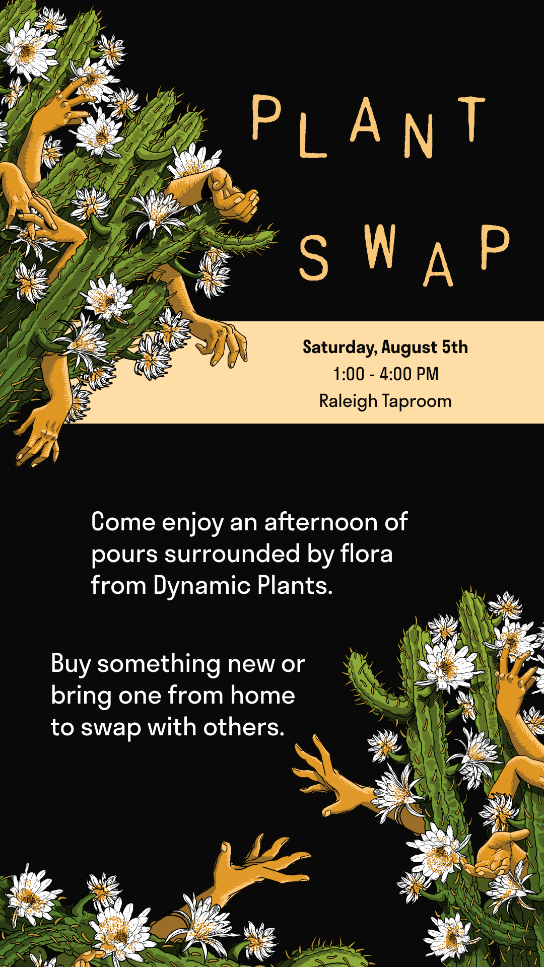 Come enjoy an afternoon of pours surrounded by flora from Dynamic Plants. Buy something new or bring one home to swap with others.